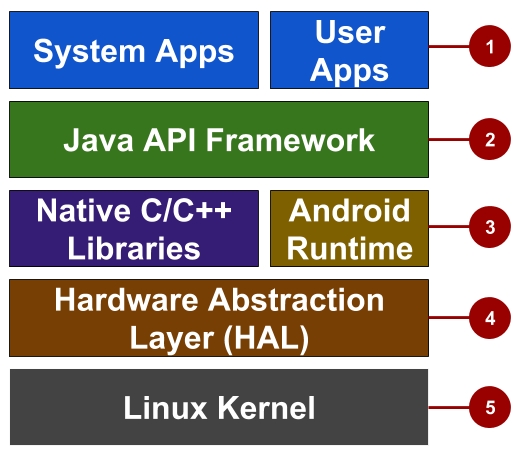 Hardware abstraction layer (HAL): This layer provides standard interfaces that expose device hardware capabilities to the higher-level Java API framework. The HAL consists of multiple library modules, each of which implements an interface for a specific type of hardware component, such as the camera or Bluetooth module.