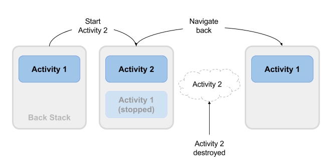 When you start an app, the app's main activity ("Activity 1" in the figure below) is started, comes to the foreground, and receives the user focus.