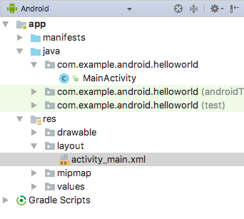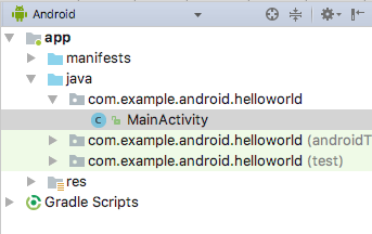 com.example.hello.helloworld(or the domain name you have specified): All the files for a package are in a folder named after the package. For your Hello World app, there is one package, and it contains onlyMainActivity.java. The firstActivity(screen) that the user sees, which also initializes app-wide resources, is customarily calledMainActivity. (The file extension is omitted in the Project > Android pane.)com.example.hello.helloworld(androidTest): This folder is for your instrumented tests, and starts out with a skeleton test file.com.example.hello.helloworld(test): This folder is for your unit tests and starts out with an automatically created skeleton unit test file.