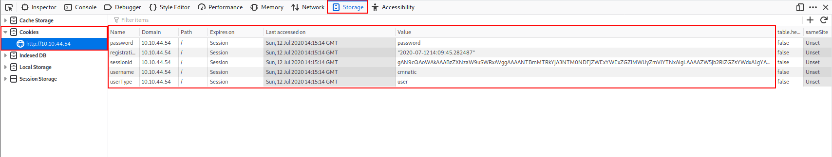 In the web application, we're going to exploit, you'll notice cookies store login information like the below! Yikes!