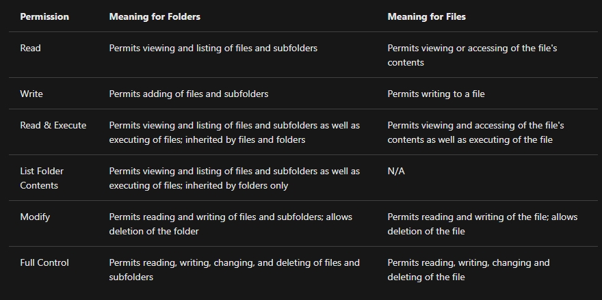 The below image lists the meaning of each permission on how it applies to a file and a folder. (credit Microsoft)