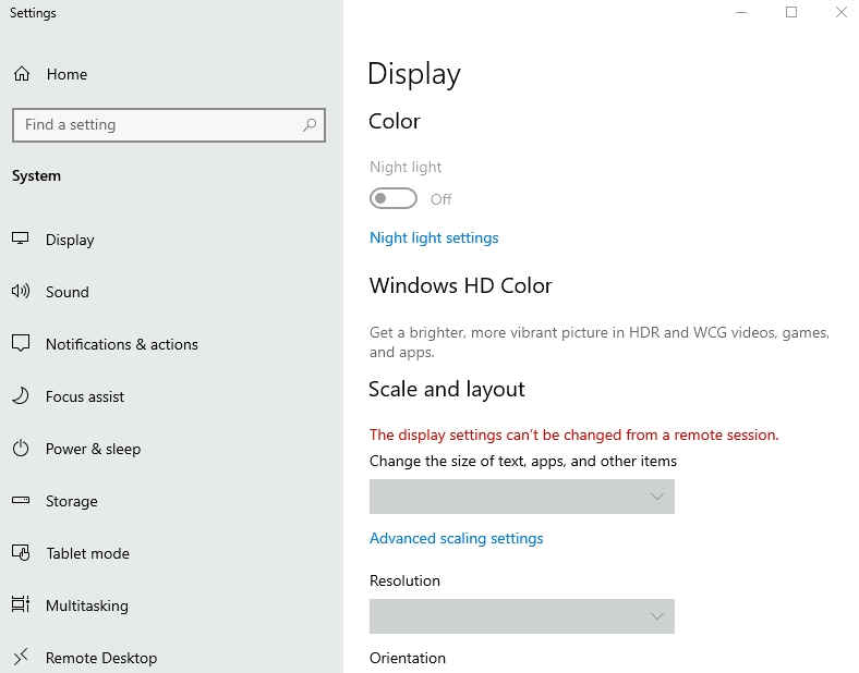 Note: In a Remote Desktop session, some of the display settings will be disabled.