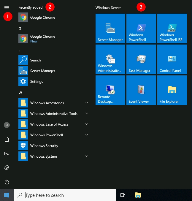 1. This section of the Start Menu provides quick shortcuts to actions that you can perform with your account or login session, such as making changes to your user account, lock your screen, or signing out of your account. Other shortcuts specific to your account are your Documents (document icon) folder and Pictures folder (pictures icon). Lastly, the gear/cog icon will take you to the Settings screen, and the power icon will allow you to Disconnect from a Remote Desktop session, shut down the computer, or restart the computer.