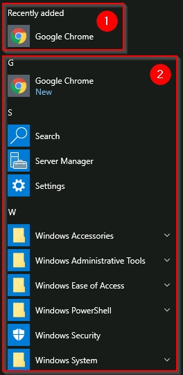 In the above image, the first box is where the recently added apps/programs will appear. The second box is where all the installed apps/programs will appear.