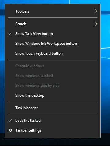 If you're like me and want to disable some of these components, you can right-click on Taskbar to bring up a context menu that will allow you to make changes.