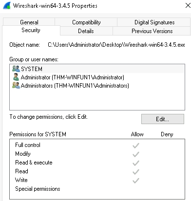 In the Security tab, we can see the users/groups and their permissions to this file. Notice that the standard user is not listed.